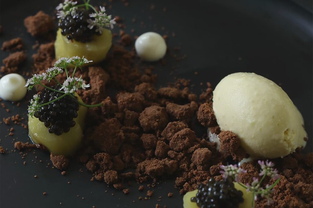 「ナスはヨーロッパでも広く食べられています。このポピュラーな食材を使ってスイーツをつくりたいと思いました。ナス料理でいちばん、ナスの美味しさが楽しめるのが焼きナス。そこで、焼きナスをアイスクリームにしてみました」。