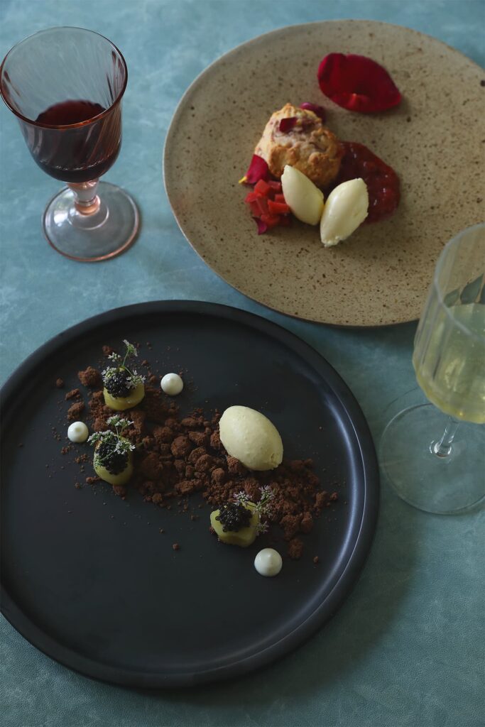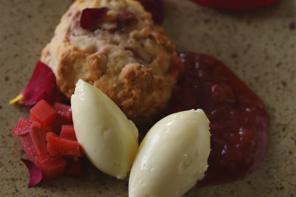 もうひと皿はスコーンに、ハチミツを混ぜたクロテッドクリームを添えたもの。このスコーンが、ただのスコーンではない。「このスコーンは、イチゴだけの水分でつくっています。するとパサパサしないし、味わいも豊かになります。酸味があるから甘味が楽しめる、そんなスコーンになっているかと思います」。 スコーンの隣にあるのはルバーブのジャムにバラを添えたもの。