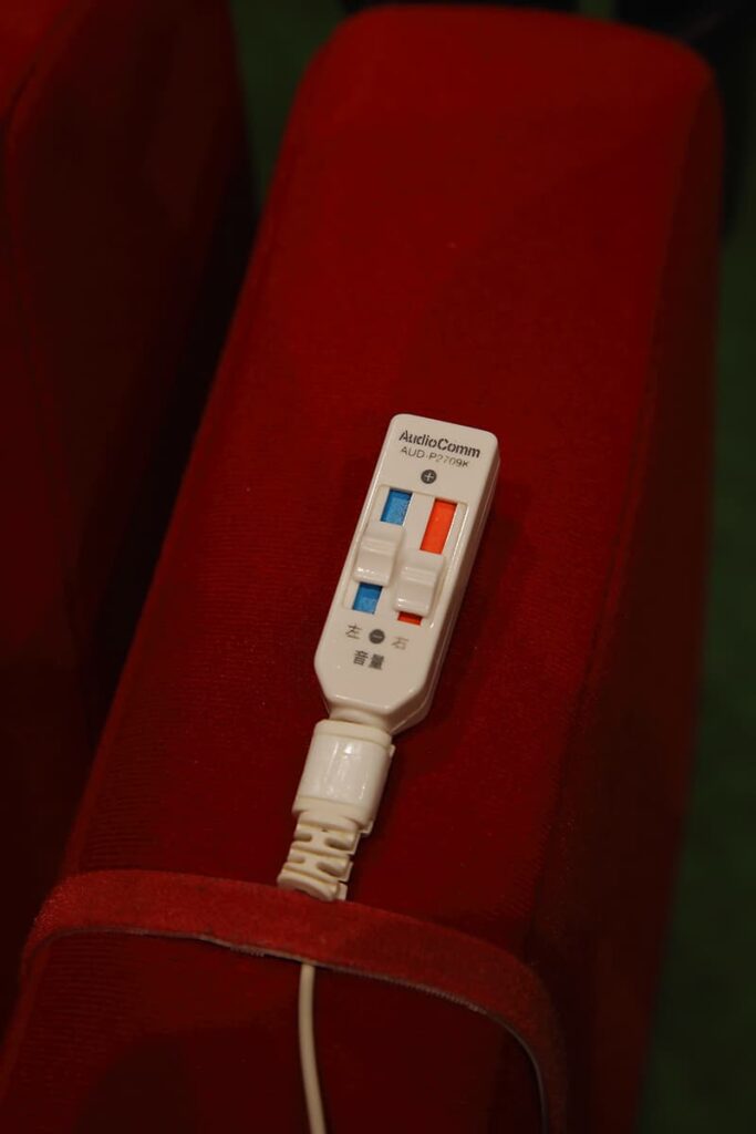 視覚障がい者はどうやって映画を鑑賞するのですか?「この映画館では全席にイヤホンジャックが装備されています。このイヤホンから流れる、映像を言語化した音声ガイドを聞きながら映画を鑑賞してもらえます」。