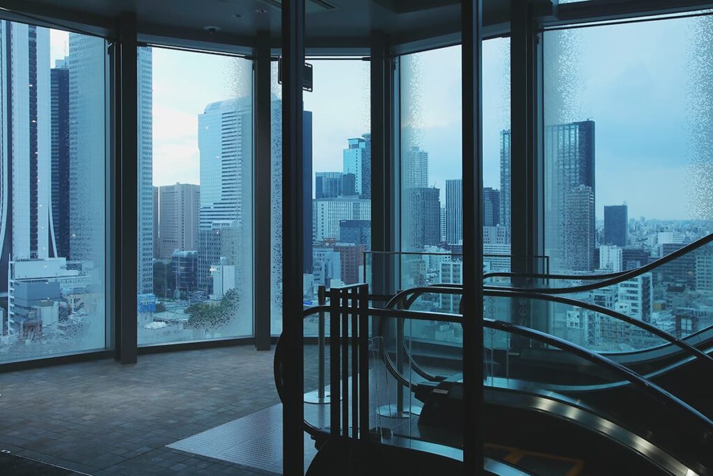 「いい映画を観たあとは余韻に浸りたいですよね。大切な人と、いま観た映画について語り合うのもいいものです。そんな時間を過ごせる場所もご用意していますよ」と古賀さんが紹介してくれたのはCLASS Sのお客さんが利用できるプレミアムラウンジ「OVERTURE」。都心が一望でき、夕方には幻想的なマジックアワーが楽しめる。
